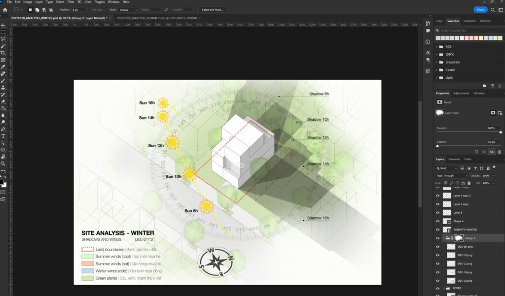 Đây là sơ đồ phân tích về bóng đổ (do Mặt trời chiếu vào công trình) và hướng gió theo mùa. Sơ đồ này là một phần trong phân tích hiện trạng.